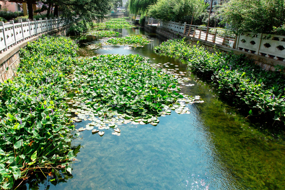 構(gòu)建水生植被:種植沉水植物菹草、黑藻、伊樂藻、金魚藻、苦草等和浮葉植物睡蓮,以吸收和轉(zhuǎn)化水和底泥中的氮、磷、鉀等營(yíng)養(yǎng)物,降低水體N、P、K及必需微量元素的含量與周轉(zhuǎn)速率,抑制浮游植物生長(zhǎng);為多種多樣的水生生物提供良好的生境,提高水體生物多樣性和水體自凈能力,且為水體供氧。